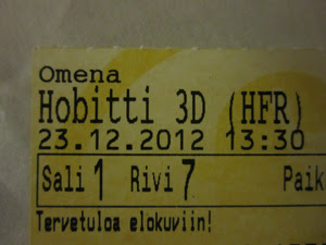 Kuriositeettina mainittakoon, että olimme mieheni kanssa eilen juhlimassa uutta työtäni ja kävimme katsomassa Hobitti -leffan. Se oli ensimmäinen 3D -leffa, jonka olen ikinä nähnyt. Ennen leffaa kysyin esikoiseltani, onko leffa liian jännittävä? Kysyin saman myös kuopukseltani. Molemmat vakuuttivat, että se on K-12. Mutta jos minulta kysytte, se oli juuri sellainen kuin oletin sen olevankin :)